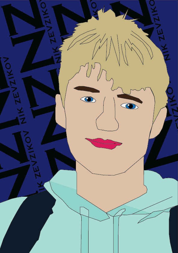 This is my first ever Adobe Illustrator portrait, being new to this software I wasn’t as confident approaching this portrait as I would have been in Photoshop. I feel like I’ve done an okay job in outlining myself, however, there is room for improvement as we can clearly see some parts of the design look rough and need to be tidied up. On the positive note, I feel like I’ve chosen the right colours to create this portrait, I’ve used two shades of turquoise to indicate the shadows on my turquoise hoodie. I’ve decided to fill in an empty background with my personalised name logo’s going across a navy background.