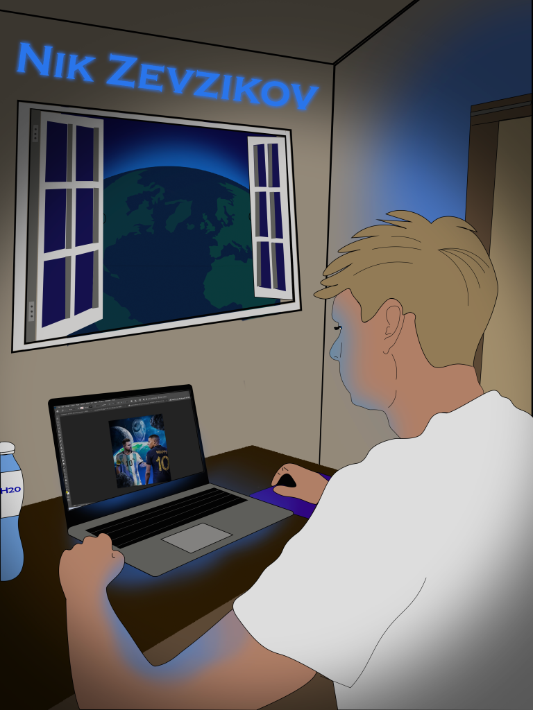 This is my first self-promotional poster which I have crafted, with this poster I didn’t use much text as I wanted to present myself through visual illustration. I have linked this poster with my passion for graphic design, which I have done through an illustration of myself sat behind my desk in my room creating graphics in photoshop. To clearly indicate this, I have included a screenshot of one of my photoshop projects and implemented it with the illustration of my laptop. I have made a 3D themed illustration however, to make this design unique and visually effective I’ve implemented an idea of space and planet earth being the view from the window of my bedroom. The meaning behind this idea is that I am in my own creative reality when designing. To make this poster visually enhancing I’ve added light reflection, I’ve added a blue light reflection on the wall as it is projected from the outer space in which we could also see a blue light projected from the planet earth. The blue light projecting can be seen on the face and arms of self-illustrated me. This being a self-promotional poster, it would make sense to include some text portraying my identity therefore I’ve added my name on the wall just above the window, to make it visually impressive I’ve made it glow in blue colour to match the overall light reflection of this design. I’ve also included some shadows in the edges of the poster which makes the name text glow even more.