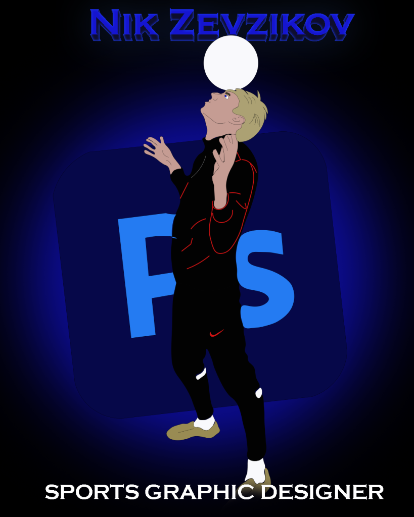 This is my second self-promotional poster, for this poster I have linked graphic design with sport which is something I am passionate for as I aspire to become a graphic designer in the sports industry specifically football. Therefore I’ve decided to illustrate myself controlling a football on my head which links to being a graphic designer in a sense of expressing myself and being creative. As you can see I’ve included an illustration of the photoshop logo which is portrayed behind the illustration of myself, I’ve portrayed the photoshop logo in the middle of the poster and added some blue light projecting from it which makes the logo glow as the overall background is black. I’ve included the photoshop logo to specify it’s importance to me as a graphic designer, as this is my favourite software to use and which I am the most comfortable with for designing. Finally, I have added some text. I’ve presented my full name at the top in blue to match the photoshop logo and the light projecting from it. I’ve also made the text 3D as it makes my name stand out and look inspiring. I’ve also added some text at the bottom briefly explaining as to what I aspire to be.