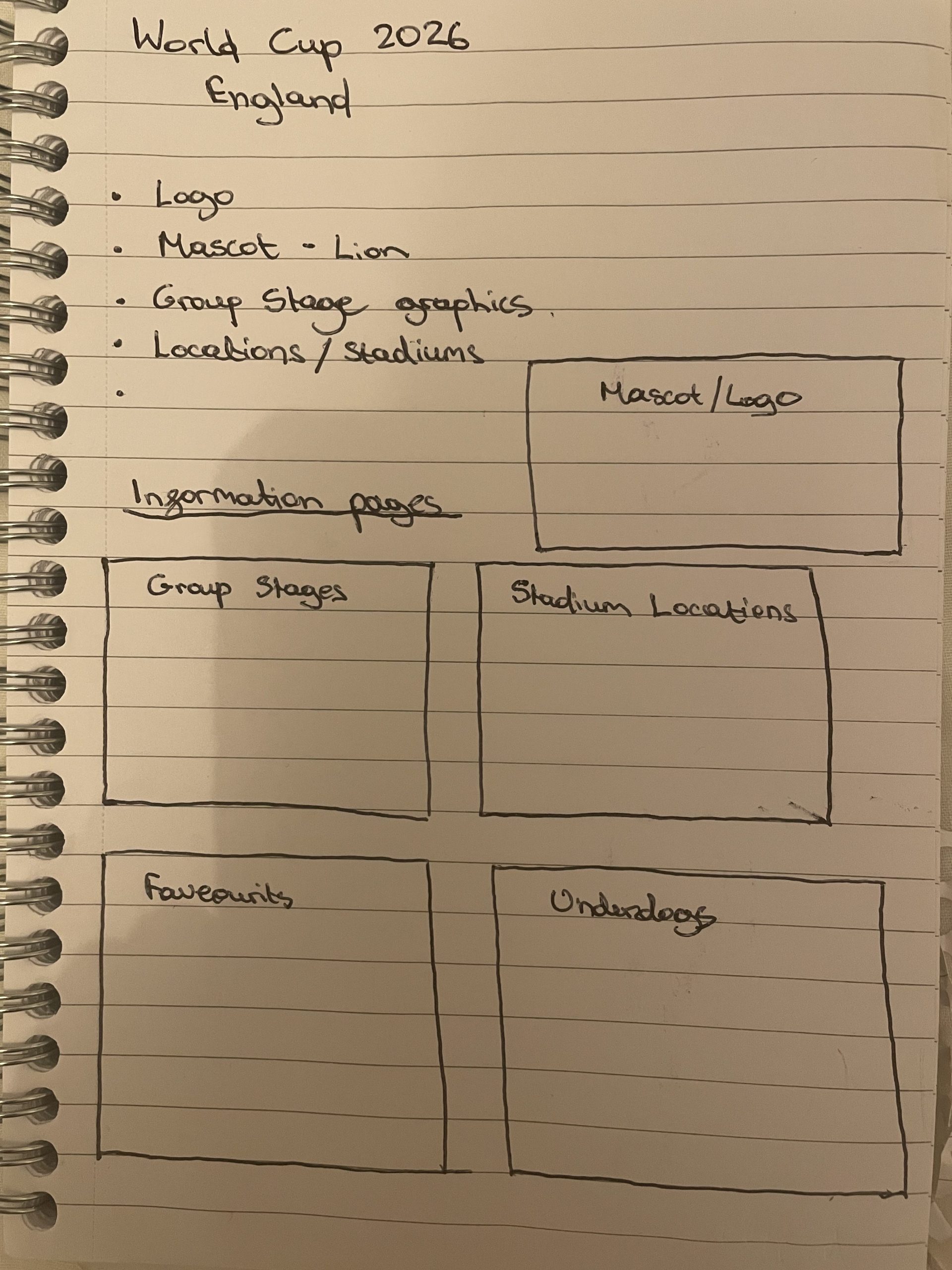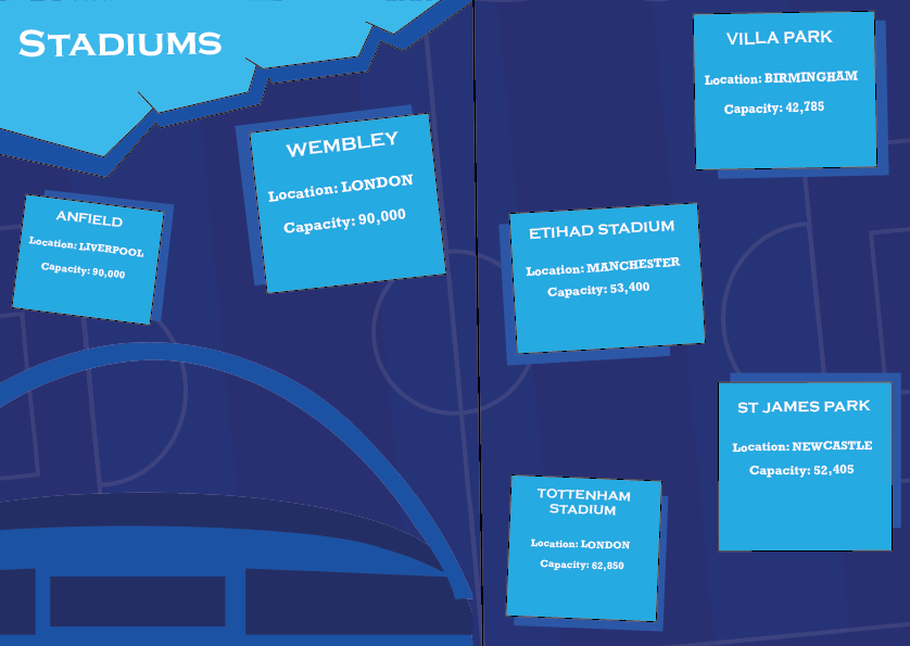 As you can see my first spread page focuses on the topic of ‘Stadiums’ which shows a summary of each stadium that will be used for the competition. I have included each stadium in the usual layout box design as each box is rotated on an angle to make the spread pages stand out and be less generic. Each of the information boxes has the name of the stadium at the top with the relevant information such as the city it is located and the capacity. To make this spread page unique and relevant to it’s topic I have constructed basic layout of Wembley Stadium through the use of shapes and colours and placed it in the left corner of the page.