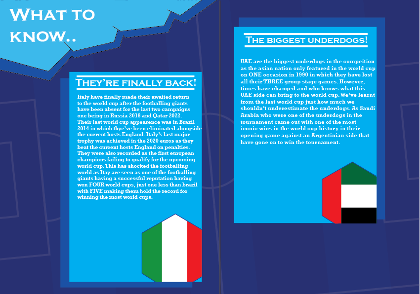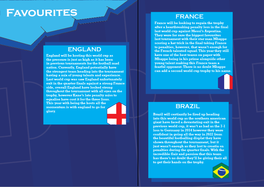 My editorial information pages which are based on the upcoming World Cup provide useful as well as interesting information for football fans across the world. Firstly, I think this product will help with promoting and making as many people as possible engage in the tournament as they’ll be feeling the world cup spirit. My spread pages consist of a main heading, sub-headings with relevant information below, and a variety of graphics that make the pages stand out and look relevant to the topic.