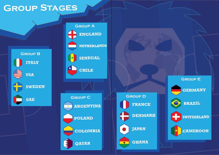 My second spread page focuses on the ‘Group Stages’ which is a main aspect of football competitions whether it is the Champions League or the World Cup. I’ve included this information as group stage draws are one of the most exciting procedures that occur before the competition starts as every nation find out who they’ll be playing to fight for the play-off spots. I’ve listed the confirmed group stages by using the same information box format however unlike the ‘Stadiums’ spread page I’ve made the boxes of groups vertically straight rather than them being on an angle as it makes it easier for the viewers to gather information. I’ve decided to add each nations flag in a hexagon shape which I’ve constructed through shapes and colour pallets as it pinpoints the nations clearer, again making it easier for the viewers to gather information, but it also adds a creative flair making the overall spread page more exciting. However, I felt that there was something missing to this spread page, so I decided to add the masthead logo in low opacity as a background image for this spread page, making it more symbolic and interesting.
