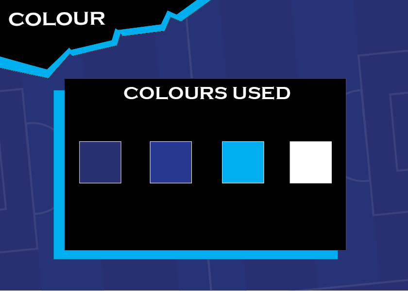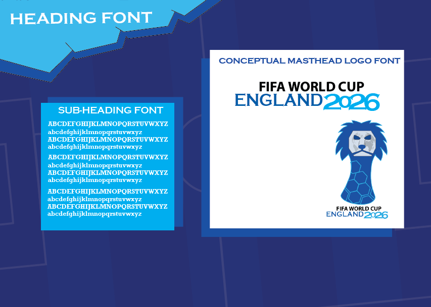 Next design page focuses on the colour that I’ve used throughout the spread pages, fonts and masthead logo. Firstly, I’ve established that navy blue and cyan will be the main colours for this campaign, the reasoning for those chosen colours links to England’s home kit which has these colours blended on the sleeves and collar. I’ve used the white colour for the typography as it is easily read-able on cyan background. As you can see this design page establishes four colours that I have used, there are two different navy-blue colours that I have used in order to create a football pitch layout as a background. I have used two different shades of navy blue to establish the typical textured grass in which I’ve done through these two navy blue colours and shapes.