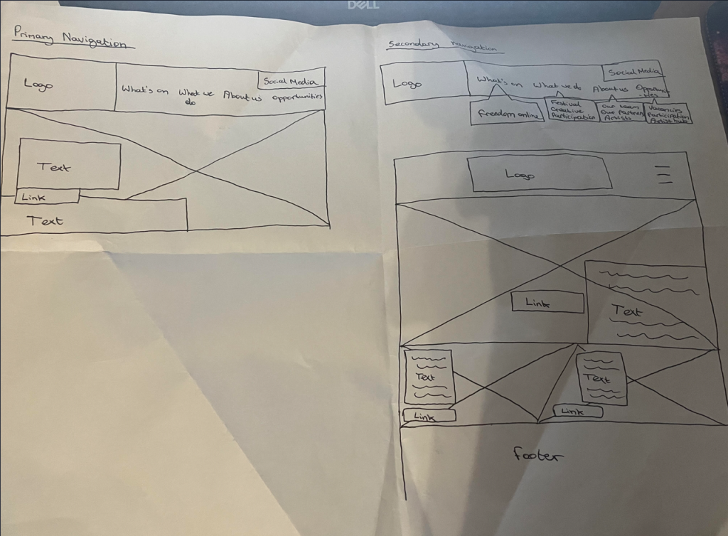 Here are my first wireframes I have sketched, demonstrating primary and secondary navigation. Firstly, primary navigation is essentially the main menu that is usually located on the front homepage of a website showcasing important, frequently accessed links whereas secondary navigation is essentially additional menus that usually link to primary navigation links such as subpages and categories serving purpose of providing additional information.