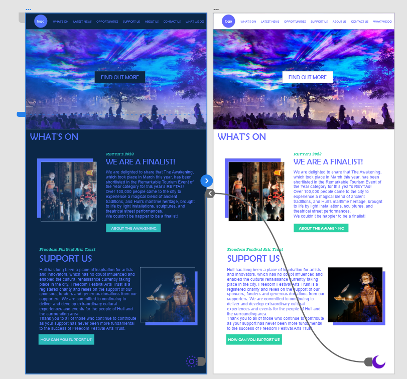 I’ve successfully managed to incorporate interactivity into my mock up website interface through the basics of prototyping alongside design choices such as iconography and colour scheme. For this mock up, I decided to demonstrate interactivity through a light/dark mode feature that I have implemented, allowing users to switch between the two different interfaces based on their personal preference.