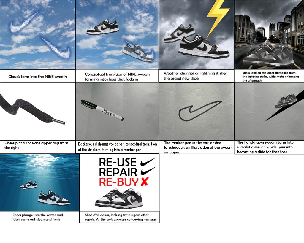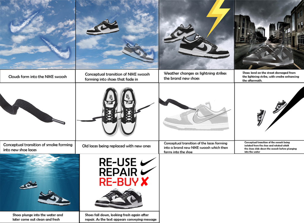I took a creative approach to this animation with the use of conceptual transitions that builds the story up as it progresses, I have taken an approach of focusing this animation on one of the world’s most popular fashion brand ‘Nike’, specifically their shoes. The storyboard essentially shows the journey of a pair of Nike trainers with the use of conceptual transitions that essentially portray damaged shoes being repaired and re-used.