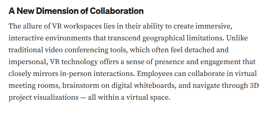 I’ve found an article that talks about the rise of virtual reality workspaces as it states the powerful VR features incorporated in workplaces and how the employees can use these VR tools to their advantage. As you could see from the article, VR offers a variety of UX features for employees to feel less detached from reality when working or having remote meetings, linking back to the placebo effect of immersive reality it makes the employees feel like they’re contributing to in person meetings whilst being at home through the powerful tools of virtual reality.