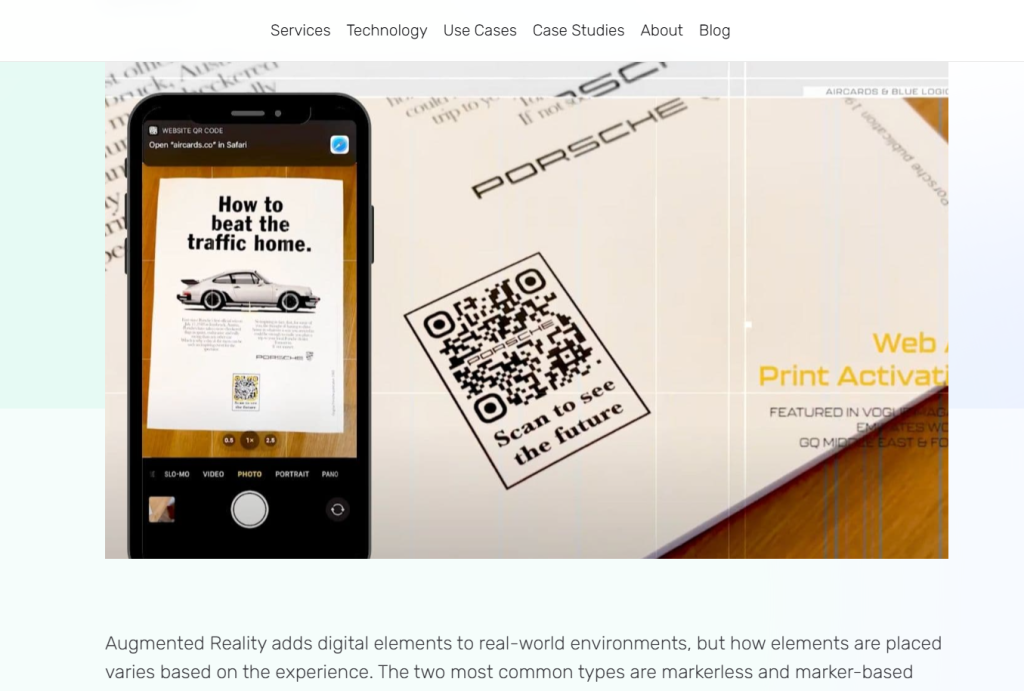 For example, car brands use marker-based AR through their QR code display available to access through leaflets or online as you can see through this article, it uses an image of Porsche’s leaflet that includes a QR code which showcases a link to one of their website landing pages, however the most fascinating detail in this AR experience is that it makes you view the transformation by hovering over the leaflet. Despite not having the actual leaflet, I could still gain access, as long as the QR code is there to be triggered which is why marker-based AR is so effective.